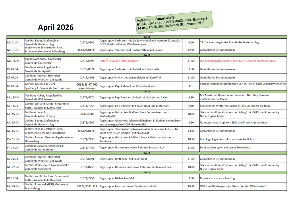 Wer Lust hat, geht einfach hin und gönnt sich ein gutes Menü. Im Anschluss gibt es immer etwas Interessantes zu tun, zu hören oder zu sehen. Die Rede ist von den MahlZeit-Mittagstischen, die in vielen Kernland-Gemeinden angeboten werden. Kommen Sie und machen Sie sich ein paar schöne Stunden!